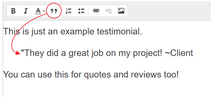 When you are signed in and go to your profile, you will see the "About" section, and in the formatting options you will see what look like quotation marks. This will automatically apply formatting that makes your testimonial stand out.