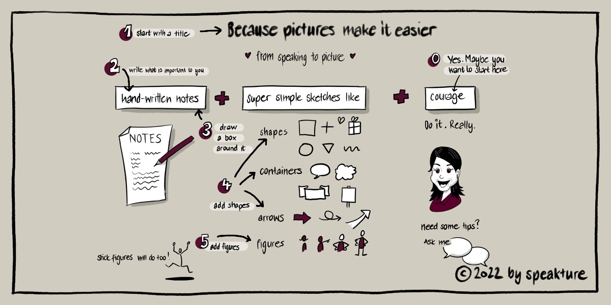 After all, it's not about winning an art prize but about the process. And with every sketchnote, there is an improvement. Or, to use Mike Rohde's words again: practice, practice, practice – you have to do it, there is no other way. But there may be a small shortcut: knowing the basic techniques and some practical tips will make sketchnoting easier, especially in the beginning. Here is more information about speakture workshops that teach such shortcuts.