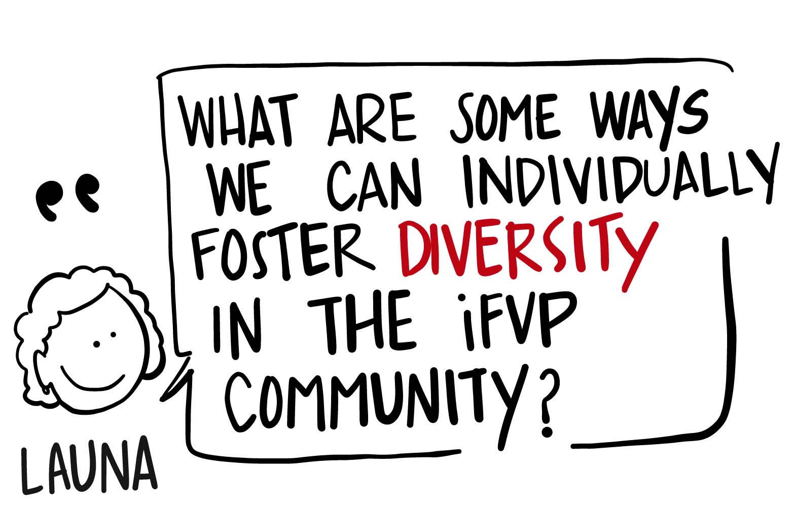 For example, I happened to meet up with another scribe at a gig. One of the pictures drawn depicted the concept of "lead from behind" with a black inked figure behind three white-bodied outlined figures. We discussed it, for me, that image recalled a time when African-Americans were forced to sit or stand behind their white counterparts. The drawing was adjusted and we found another way to represent the idea–together. It wasn't a big deal. Nobody made a scene. People may not have made that connection, but it felt good to be heard and remove the possibility of a conference attendee drawing that conclusion. If we are going to attract even more diversity then being mindful of how we show up and make space is an absolute must. The last thing we want is for people to walk away from the platform feeling like IFVP there's no room on our train for "them".