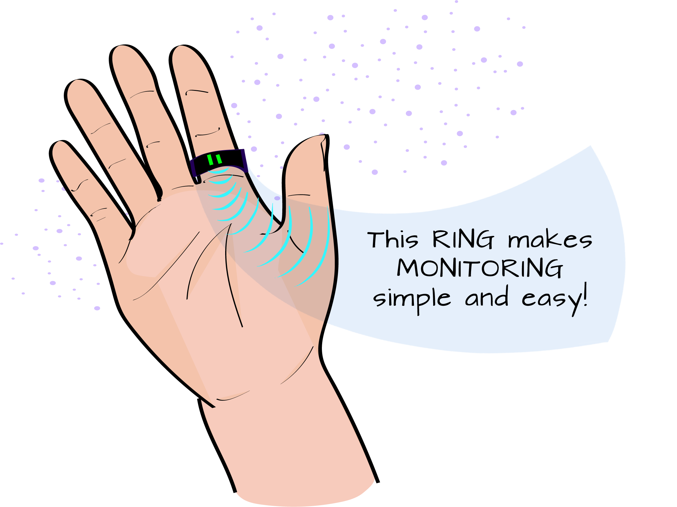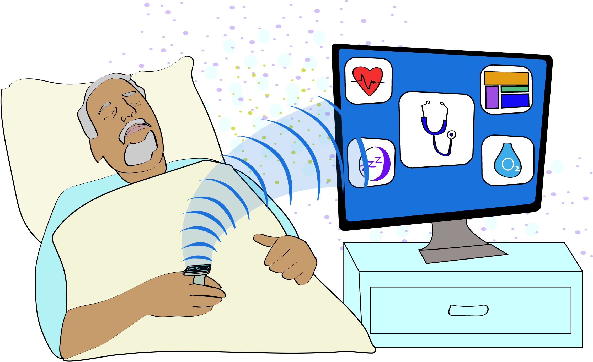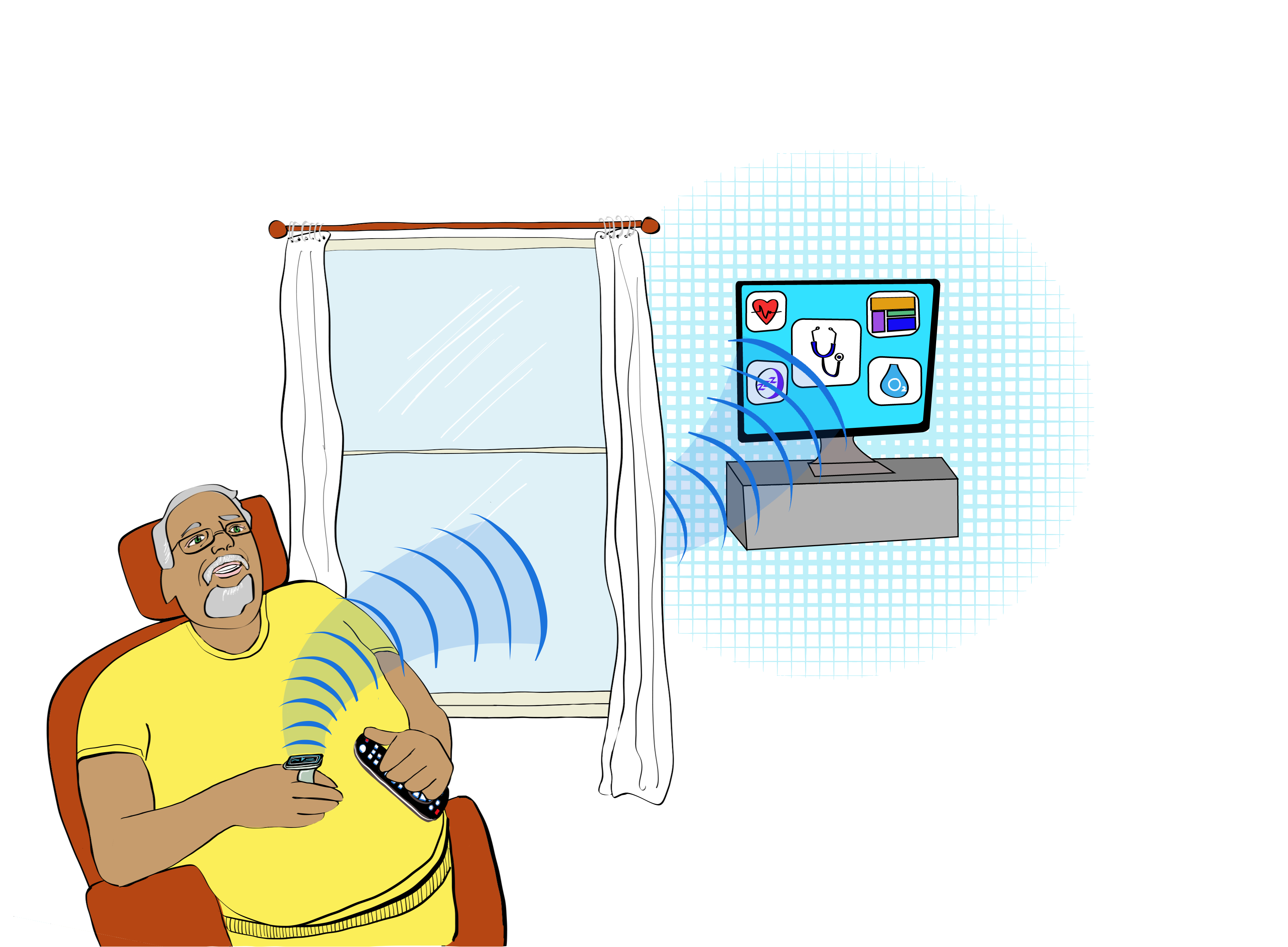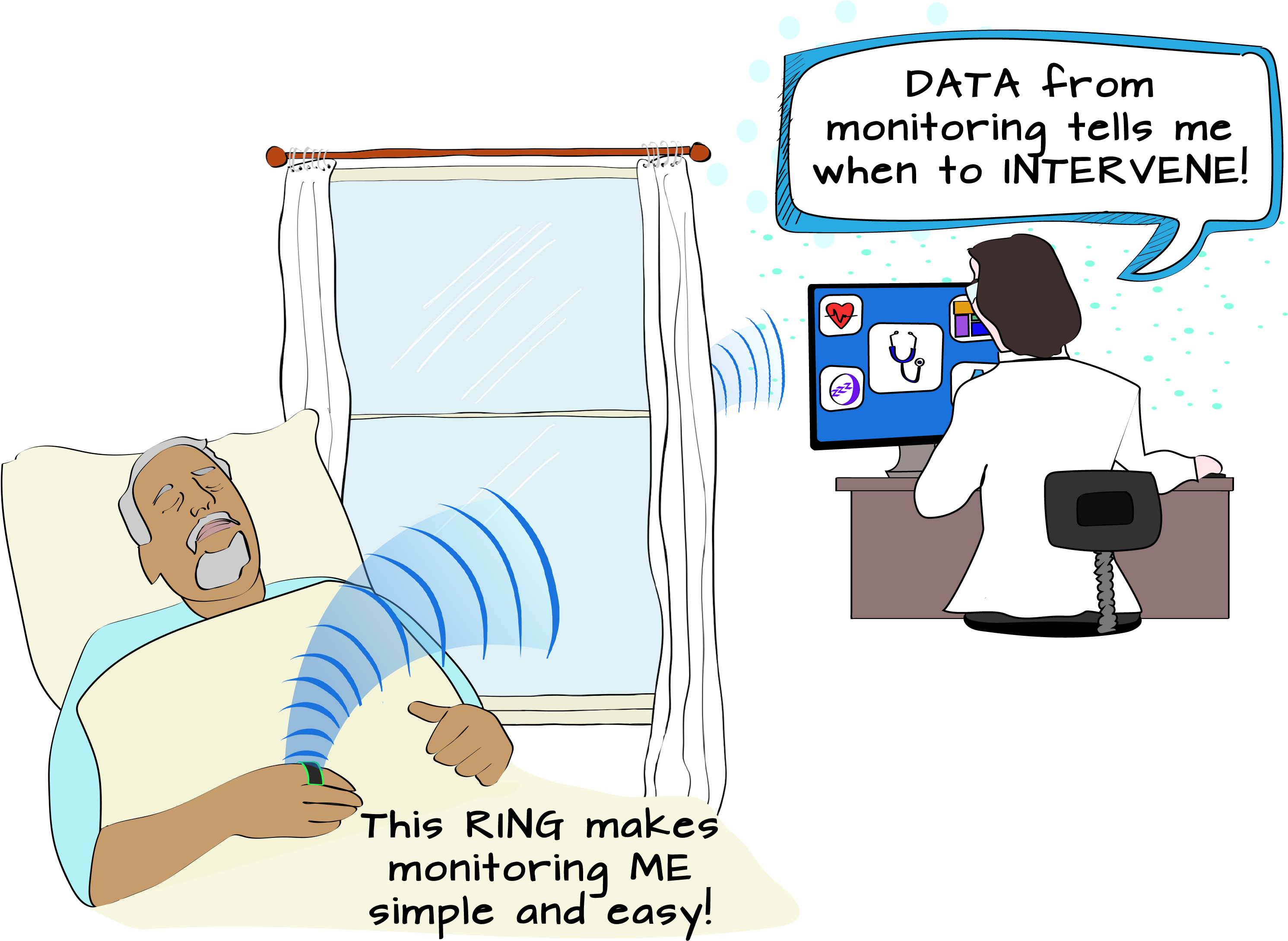 I love the opportunity to tell a story with graphics – sometimes drawn on the spot in real-time during a meeting, and in other instances, in my studio with more time to think about how to portray the idea. Recently a client asked me for an illustration to use on her telehealth website.  She asked me to draw a patient in his bed wearing a ring on his finger to indicate his health was being monitored to a computer.
