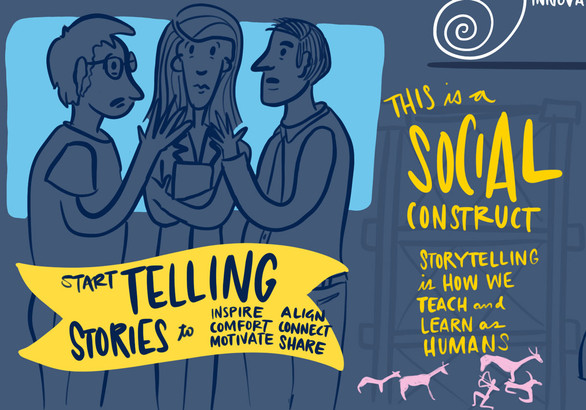 But what I really like in this graphic is the small reproduction of the wall painting from a recently discovered cave painting by Neanderthals some 20,000 years ago. Through stories, humans relate experiences, lessons, cautions, insights, and advice to navigate the world. It is one of the first forms of communication our species developed as a tool for the survival of the first peoples in the harsh environment of the Upper Paleothic age. Stories are the vehicle for learning and teaching and we must never forget the power a story holds. I also like the scaffolding in the back to connote storytelling as a structure we have used since the beginning of time. Contrast the hunter’s intention and concern around food to the three people standing around, worried by the uncertainty COVID brings to work, life, health, the economy and our future. How far have we come and yet, we still have the same concerns for our survival.