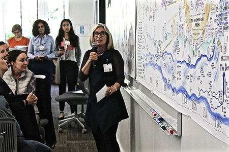 "Our relationship has always been pure and joyful. I never grow tired of it." The marriage has opened Eileen up to a deeper understanding symbols. "Now, I trust the symbols to speak to me and participate in the storytelling. I look to see what symbol has emerged. My favorite example is when a group kept going back and forth between their value chain and complaints about issues they were having. I'd draw the chain across the page and those gripes off in a corner eventually linking them. During the final viewing of the work someone said, 'OMG, it's a ball and chain!' They were being weighed down by the unresolved issues that kept them from doing what they needed to fix their supply chain. Words capture ideas; images free them."