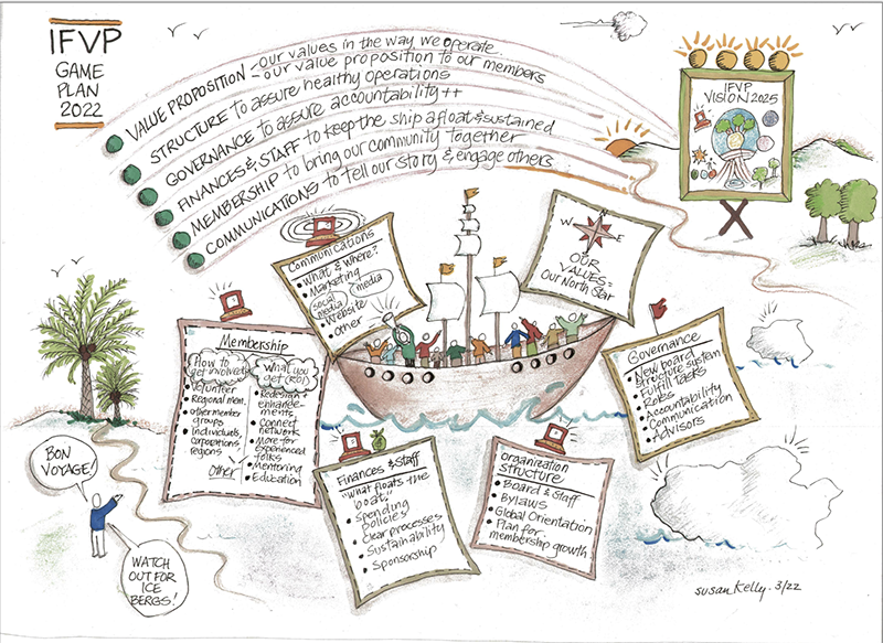 Coming out of the covid years and looking at all of the changes taking place in meeting styles and the challenges faced by our members, the 2022 Board of Directors undertook a series of guided strategic planning sessions to see what might need to evolve or change in our IFVP life. Those meetings led us to new mission and vision statements, as well as six initiatives and six committees that we will be working on/with through the next year. They are listed below.