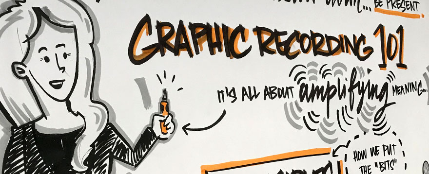 Jessamy Gee at VizConf conference, with Justin Cheong scribing behind her