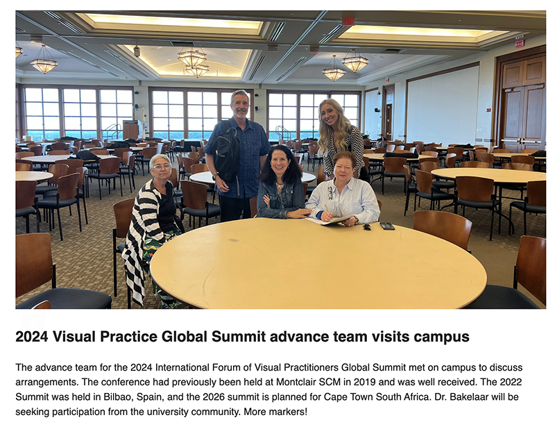 Some of the members of the 2024 Summit team visited Montclair on Tuesday, August 15 to meet with representatives from the School of Communication and Media, the Broadcasting department, housing services and the gala meeting room. We spent some time in downtown Montclair (see the Montclair Center website!!!) with brunch in a Turkish owned cafe and in the evening had dinner in a bookstore/Italian restaurant combination! We've learned from 2019 about the importance of providing transportation to and from downtown, so watch for news about that. We had an especially encouraging meeting with the Broadcast department about the opportunity to use their digital video recording studios to create professional videos for our attendees. We also met with the director of the school who engaged us in an amazing conversation about the importance of storytelling in a time when so much is changing in media. Watch for future notes to understand why he suggested we "Ask the horses..." about adapting to change! You can see the picture above in the online Montclair Weekender newsletter for August 18. They know we are coming and are glad to have us back!