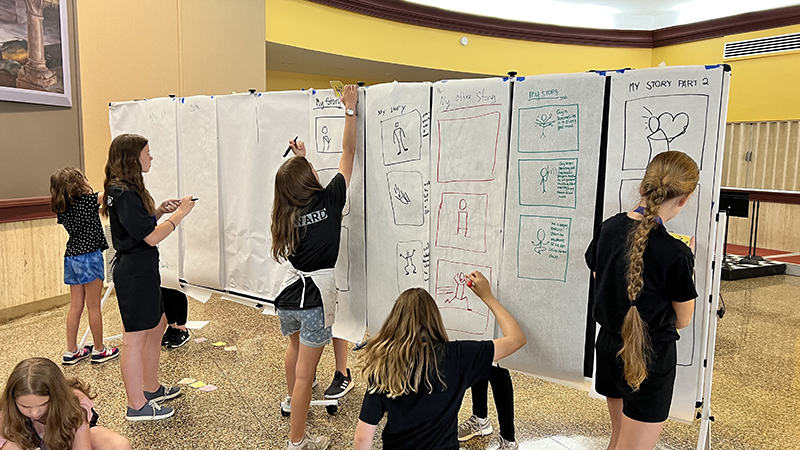 As an educator and a visual practice enthusiast, one of the happy things I get to do is bring the two together. This past week I was invited to offer some visual "draw on the wall" instruction to youth at a theatre camp. For two days I had 13 young people working with bikablo icons and cards and my Neuland wall to create visual metaphors of the camp experience and "three card stories" for visual storytelling practice. It was great to see them catch the idea and run with it! Perhaps future members of the IFVP! Like with all of us, some of them evidenced stronger aesthetic drawing quality than others, but all of them understood that what we are working on is combining visuals and text to communicate. I'm grateful for all of those in our community who are working with children and youth to bring the benefit of visual thinking to all they do.