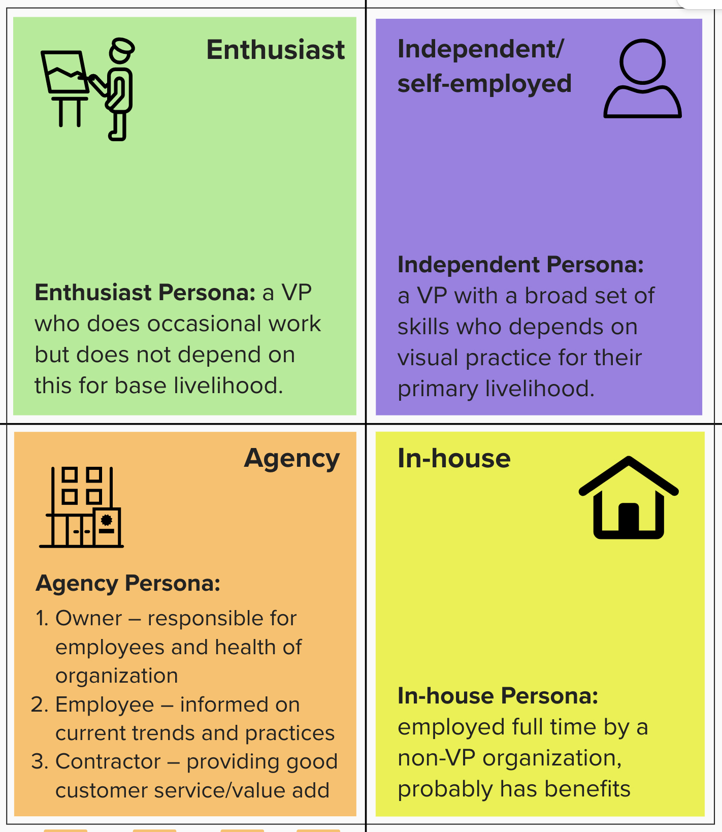 Independent/Self-employed captures another large part of our community of visual practitioners who do graphic recording and graphic facilitation as a main part of their livelihood and financial income. These may be just starting out, or may have decades of experience. They have concerns around promoting their practice, managing client expectations, dealing with basic business issues like accounting and insurances and contracting.
