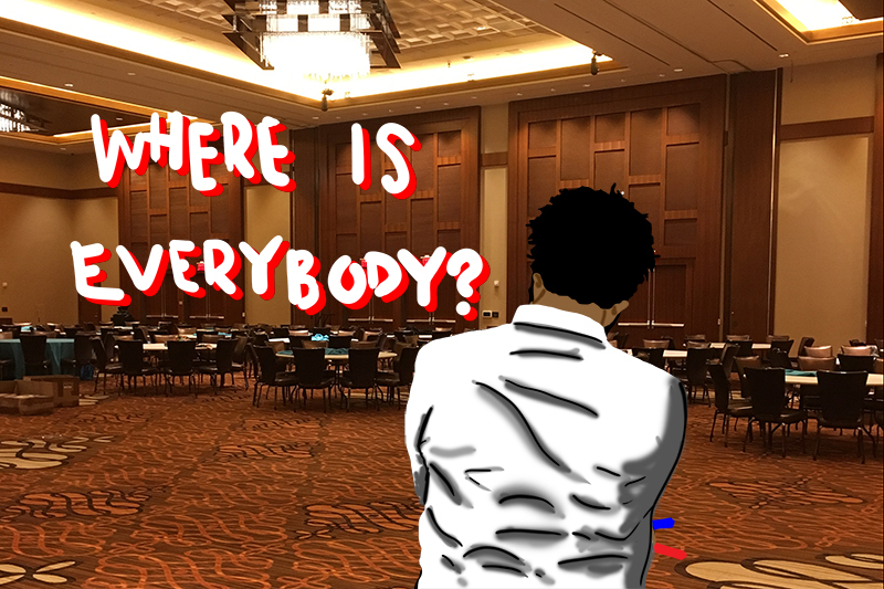 When we arrive, I notice that the venue is still setting up the tables and the stage looks a little smaller than anticipated, but “it’s still early” I thought. I thanked my friend for helping me out and after he leaves I practice setting up my board easels and boards. That takes about 10-15 minutes. Then I walk around the ballroom eyeing the architecture and all the little details. "Hey–where are the screens?" I thought.