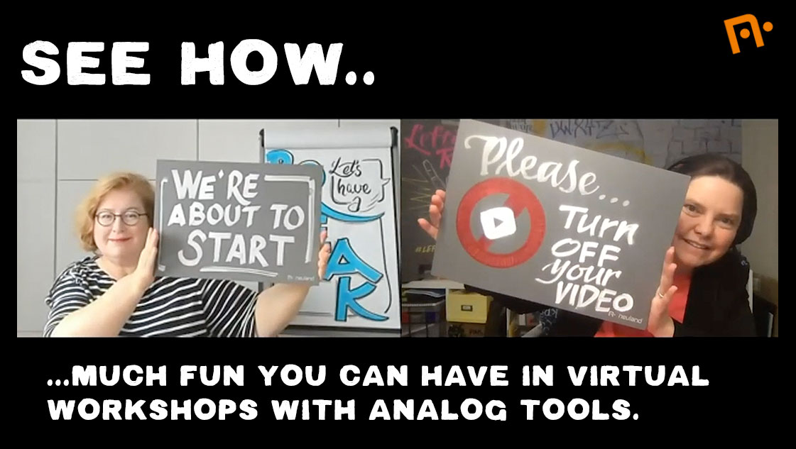 How to be successful with analog tools in your virtual meetings and workshops Purchase the recordings and handouts here People often ask: "Can I bring my flipchart into my live online workshop?" Sure, you have our blessing. Where would we be if we had to do this whole online... -