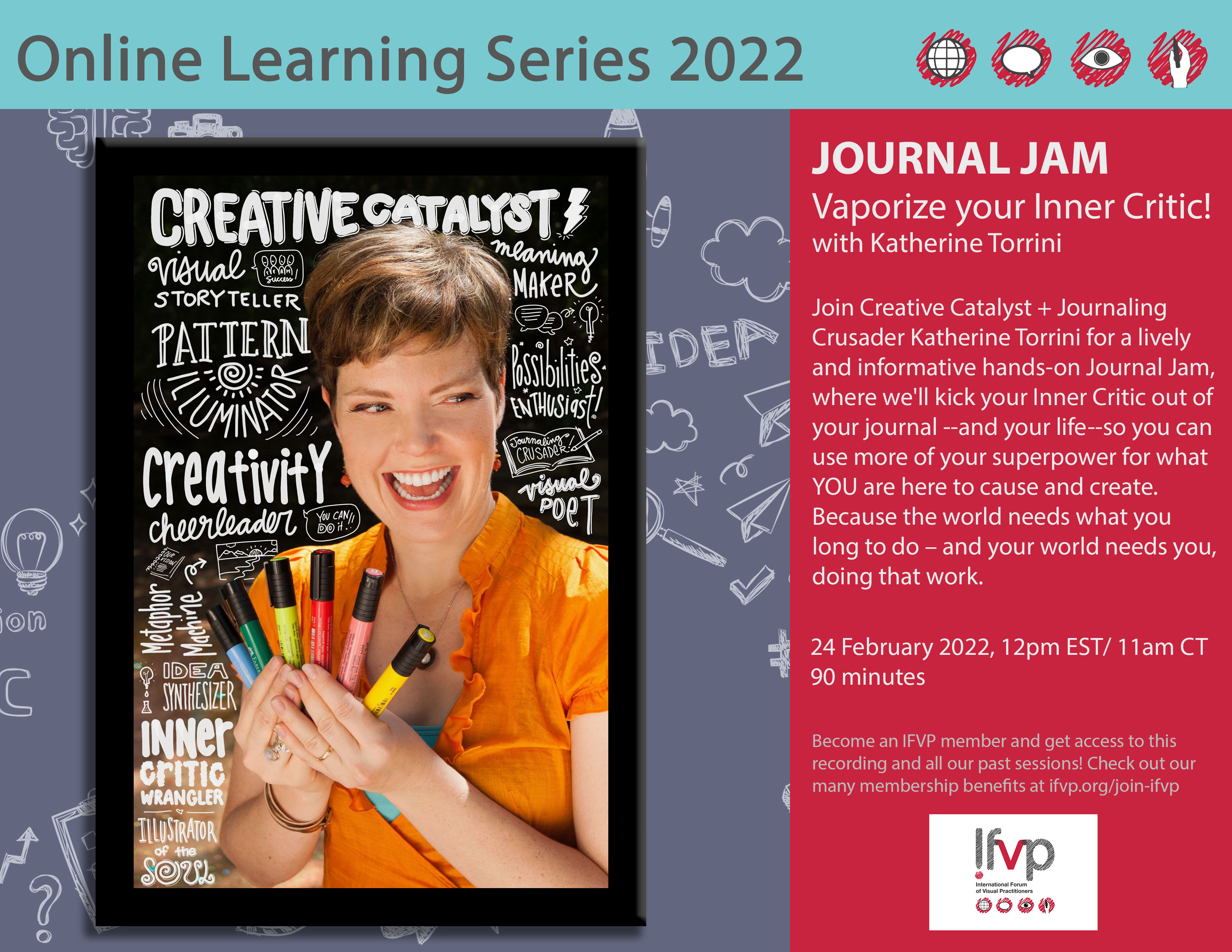 FREE EVENT! Everyone welcome, from art journaling "pros" to new and closet wannabe journalers! Kick your Inner Critic out of your Journal! March 23, 2022 9am PT/ 11am CT/ 12pm ET Join Creative Catalyst + Journaling Crusader Katherine Torrini for a powerful and inspiring Journal... -
