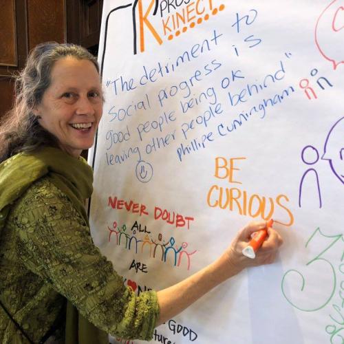 Julie Swanson is a storyprenuer, graphic facilitator, and emergent learning guide. She started What’s Possible Now, LLC as a base for her learning journeys to explore new ways of working in the world that are in alignment with nature. Julie gives presentations, hosts workshops and co-creates learning journeys. She is a certified Zentangle Teacher and Veriditas trained Labyrinth facilitator.