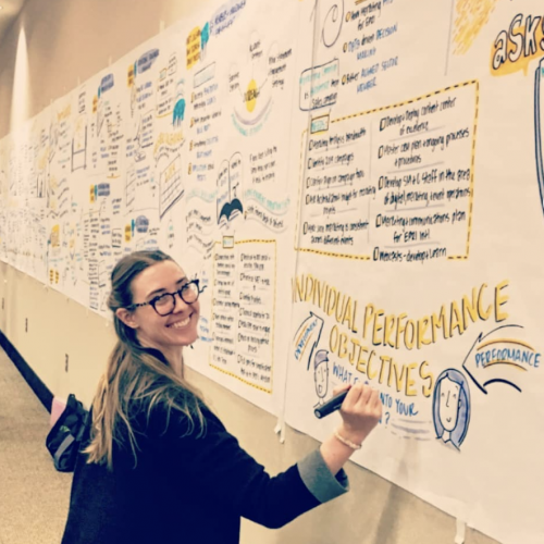 Malgosia Kostecka specializes in creating interactive visual frameworks for group collaboration and strategic visioning. With a background in education and project coordination, Malgosia is dedicated to leading participants in their process design, using creativity to achieve fruitful outcomes. She pursued the field of graphic facilitation after witnessing how previously frustrating meetings became successful and engaging with the use of a shared visual memory. Malgosia holds a bachelor of arts in psychology and fine art from The University of California, Santa Cruz.