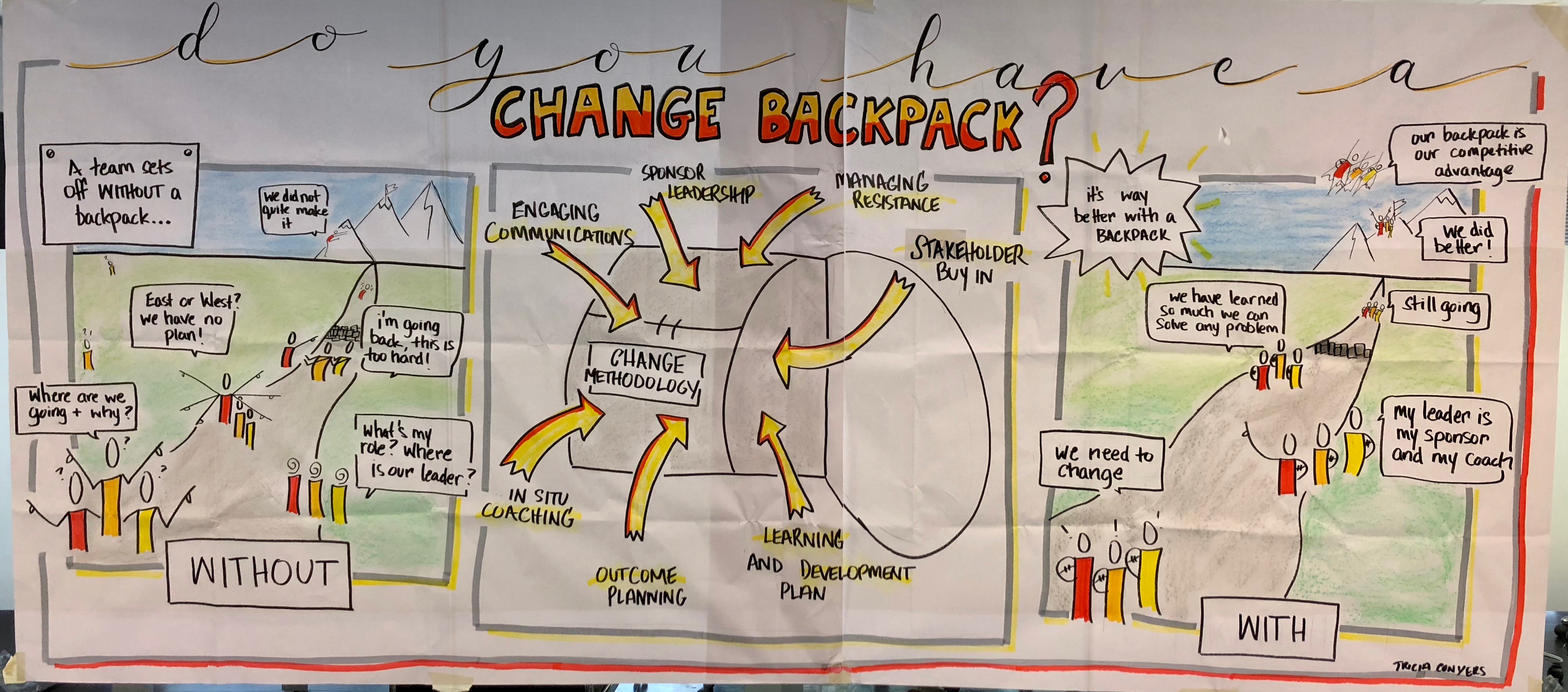 Tricia Conyers is change coach, learning experience designer, trainer, facilitator, meeting designer and graphic recorder. She is passionate about navigating the experiences of change, making learning experiences powerful, making conversations visual and helping others solve problems by unlocking their best thinking.